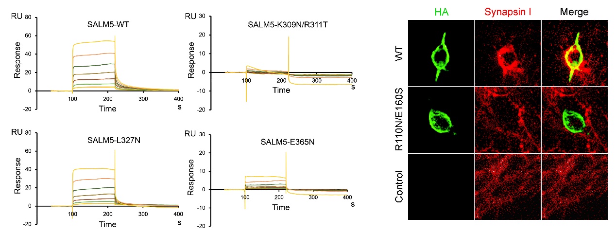 刘合力团队利用分子生物学手段及蛋白质X-射线晶体学技术解析了SALM5及SALM5/PTPδ复合物的晶体结构,直观地展示了SALM5及PTPδ在突触间的相互作用模式:区别于LAR-RPTPs受体家族的其他配体,两个SALM5分子主要通过LRR结构域反向平行堆积而形成具有二重对称性的二体;SALM5二体作为桥梁连接两个分开的PTPδ分子,从而形成化学计量比为2:2的异源四聚体。基于晶体结构,作者进一步设计了SALM5以及受体PTPδ的相关突变体,通过化学交联、超速离心分析及异源突触形成等实验证明了SALM5的二聚化是其发挥诱导突触分化功能的前提,并通过表面等离子体共振技术及细胞免疫荧光等实验发现并确证了蛋白相互作用的关键位点。该研究不仅首次解析了SALM蛋白家族成员的晶体结构,揭示了SALM5发挥生物学功能的基本单位,而且提出了受体PTPδ在神经突触分化中跨膜信号转导的新机制,这将为进一步确证SALM5/LAR-RPTPs信号复合体为自闭症的药物靶标奠定基础。