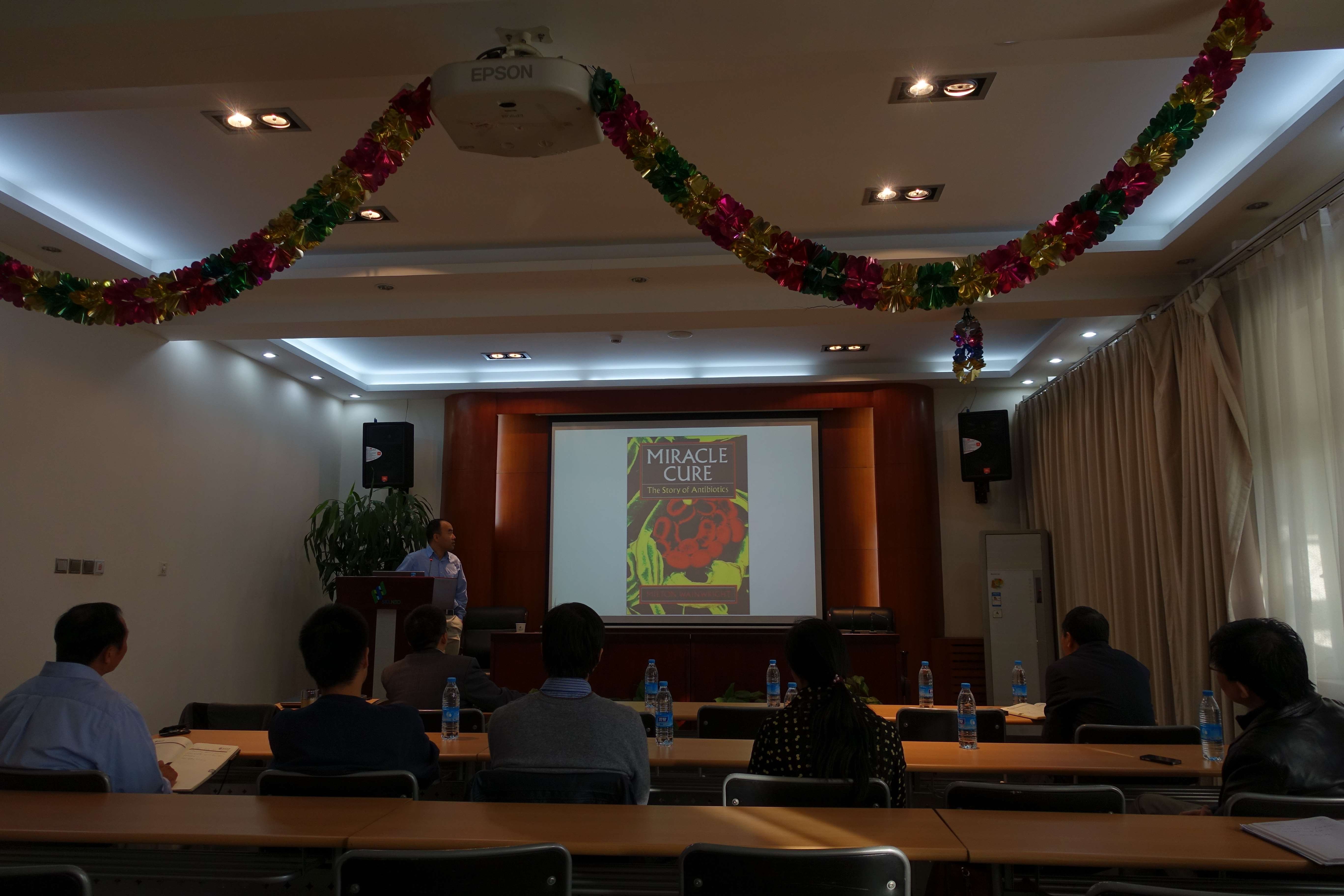此次周沛教授做了题为“Translating structural insights into novel antibiotics against gram-negative pathogens”的学术报告。报告中他主要介绍了以胞质锌金属酶LpxC为靶点,并结合蛋白质结构及动力学性质,进行小分子抗菌药的设计合成及药效评估,周教授还同时简单介绍了快速NMR方法的原理及应用。报告不仅开阔了学生的视野,也为大家的科研工作提供了新的思路。